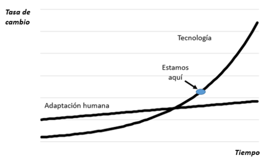 En el siguiente gráfico se comparan las tasas a las, por un lado, han avanzado la tecnología y, por el otro, nuestra capacidad de adaptación. Los humanos progresamos de forma lineal. La tecnología lo hace de forma exponencial. Cuando el desarrollo de la tecnología se encontraba en sus albores, los humanos podíamos ir asimilando los cambios más a o menos al mismo ritmo. Pero como buena función exponencial, cuando la tecnología ha entrado en la fase en la que la pendiente es alta (esto es, el ritmo al que varía la tasa de cambio –o segunda derivada- se incrementa), la distancia se hace creciente. La relación entre humanos y tecnología ha entrado en una etapa en la que no somos capaces de asimilar los cambios al tiempo al que se producen. Las innovaciones tecnológicas son cada vez más complejas y se corre el riesgo de no entenderlas y, sobre todo, de no adoptarlas.