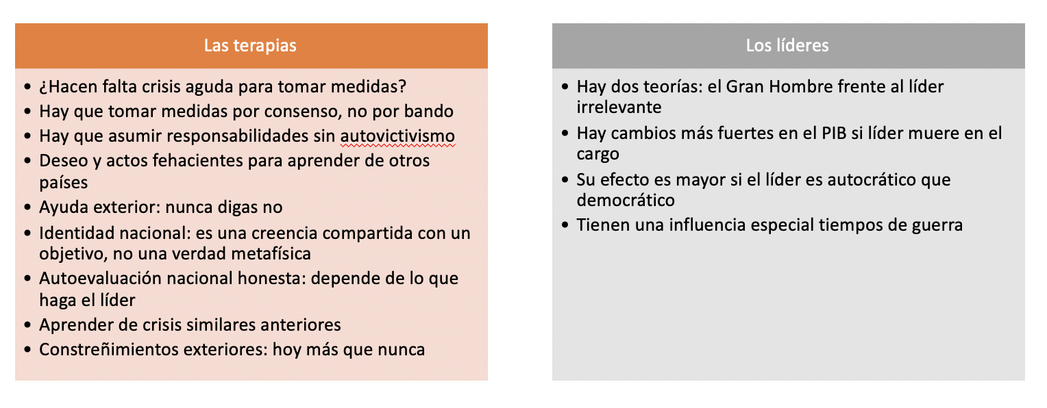 Aunque es difícil priorizar de entre las doce terapias que recomienda, ya que pueden aplicar desigualmente en cada caso, me atrevo a sugerir que actuar desde una identidad nacional definida y con valores centrales y de comportamiento claros es clave para afrontar una crisis de país, porque será más factible asumir las medidas y sacrificios que siempre impone su resolución. Ambos factores junto con el liderazgo apropiado se me antojan la clave de bóveda en tiempos de crisis.