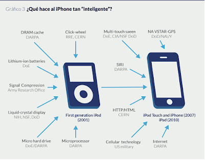 La propia internet surgió de ArpaNet, una iniciativa de la DARPA (agencia de proyectos de investigación avanzada de la defensa de EEUU) para conectar los sistemas de satélites, que a su vez también dio lugar a los sistemas de geoposicionamiento (GPS). Como se expone debajo, muchas de las tecnologías que dieron lugar al iPhone surgieron de los presupuestos públicos del gobierno de EEUU.