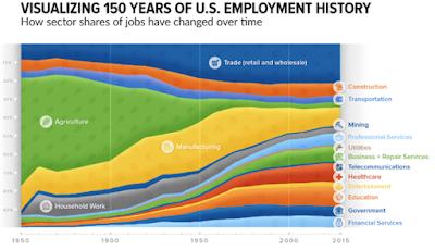 4. “La revolución que tenemos por delante, la de la inteligencia artificial, va a ser tan relevante o más que la de Internet, a la que seguimos tratando como una novedad y definiendo como “nuevas tecnologías”. Cuando esté completado el ciclo de cambios, tendremos muchos motivos para pensar que no habrá menos trabajos, sino más y de mayor calidad”. Aprovecho para insertar un gráfico muy elocuente: ¿qué pensaría un agricultor de EEU. en 1850 ante el futuro desarrollo tecnológico?