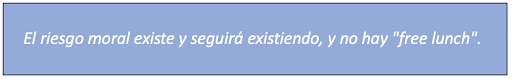 Por tanto el riesgo moral está en buena parte incrustado en la estructura de las leyes que nos gobiernan. Si nos gobiernan leyes distintas, y aunque las leyes no son un contenedor absoluto de los principios morales de una sociedad, el riesgo moral entre sociedades o países también existe.