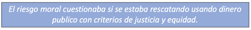Una vez más, el riesgo moral al decidir a quien rescatar con los recursos del estado. Pero esta es una visión simplista, porque no considera las consecuencias de haber dejado caer a las antiguas cajas de ahorro, lo que hubiera sido un golpe devastador a la confianza en la protección de los ahorros de las personas y empresas en las cuentas de bancos y cajas de ahorros. Podemos argumentar que el rescate de las cajas se podía haber realizado y ejecutado de forma diferente, pero no existía la opción de no hacerlo.
