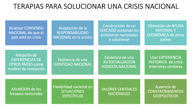 Aunque es difícil priorizar de entre las doce terapias que recomienda, ya que pueden aplicar desigualmente en cada caso, me atrevo a sugerir que actuar desde una identidad nacional definida y con valores centrales y de comportamiento claros es clave para afrontar una crisis de país, porque será más factible asumir las medidas y sacrificios que siempre impone su resolución. Ambos factores junto con el liderazgo apropiado se me antojan la clave de bóveda en tiempos de crisis.